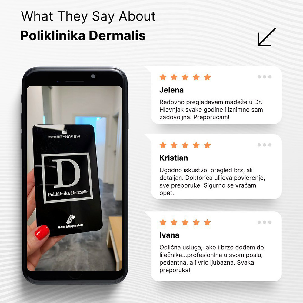 Korištenje Smart-review pametne kartice je jako jednostavno i brzo, u samo tri koraka možete podijeliti svoje iskustvo na odabranim platformama!